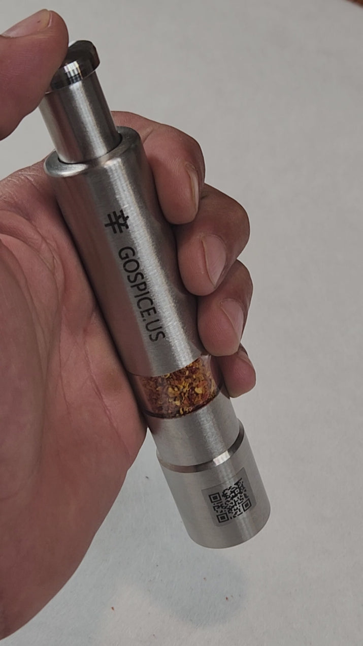 The GO2 Chili Grinder 2025's Best "Dry Hot Sauce" Freshest Chili Pepper Flakes paired with this durable stainless steel one handed portable grinder. A secret weapon of chefs, bartenders, travelers and serious foodies. Choose your flavor and heat level to spice up your life.